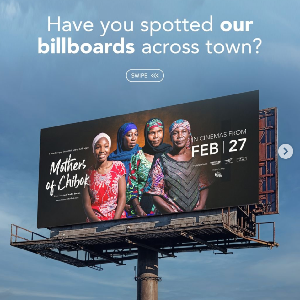This release by FilmOne is the widest local theatrical release ever for an African-made documentary. The film opened on more than sixty screens and was the number 8 film at the Nigerian box office. Take a look at the gorgeous MOTHERS OF CHIBOK billboards that are now spread throughout Lagos.